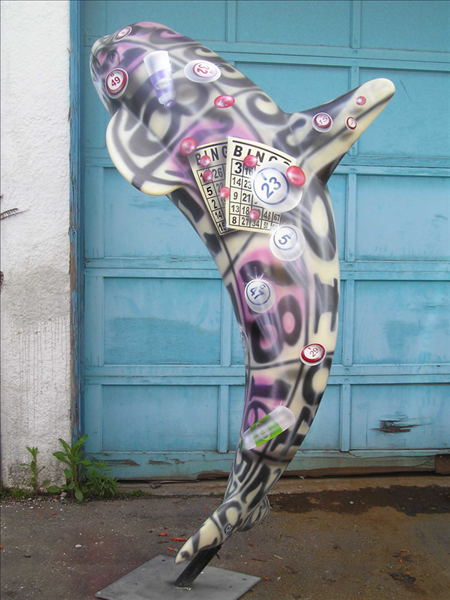 As part of B.C. Lions Society for Children with Disabilities charitable campaign, the B.C. Lottery Corporation asked us to create orcas which represent the themes of casino games, bingo and lottery tickets. Tons of detailed airbrushing went into these and we even created custom sculpted bases in the shape of their logo which looked like splashing water. We also had the privilege to create an orca for Vancouver's William Tell Restaurant which featured iconic Swiss images and symbols along with British Columbian/Canadian imagery to showcase the client's heritage. In keeping with the William Tell theme we sculpted and mounted atop the orca's head a giant apple with a bite taken out of it, an arrow piercing through and a barrel flask in its mouth!