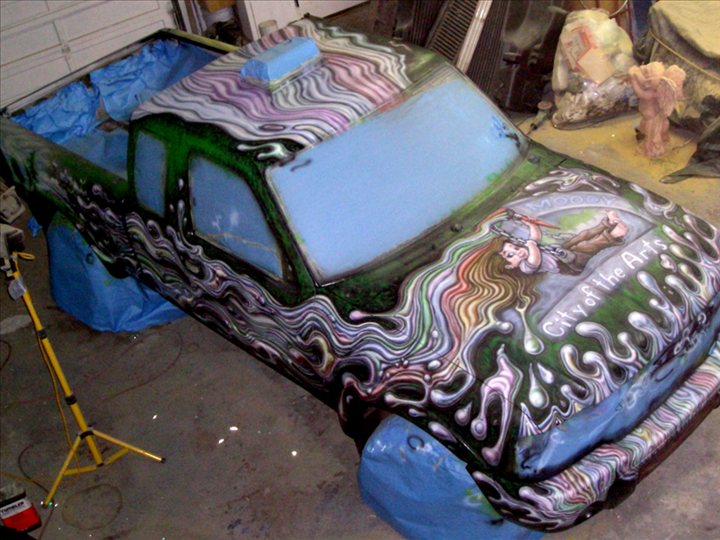 The City of Port Moody asked us to airbrush their new Playgrounds maintenance vehicle and we created a theme which embraced the arts and the natural landscapes of the city's parks. We took the concept of classic hot rod flames and altered them to be streams of colourful liquid paint which flows across the vehicle surface. Airbrushed grass, trees, salmon and landscapes are hidden behind or within the streams of paint. On the hood a little girl swings in front of the City's welcome sign as the paint brush she holds aloft like an Olympic torch creates a flowing rainbow of colours.